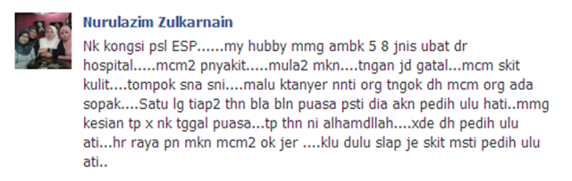 "Nk kongsi psl ESP......my hubby mmg ambk 5 8 jnis ubat dr hospital.....mcm2 pnyakit.....mula2 mkn....tngan jd gatal...mcm skit kulit....tompok sna sni....malu ktanyer nnti org tngok dh mcm org ada sopak....Satu lg tiap2 thn bla bln puasa psti dia akn pedih ulu hati..mmg kesian tp x nk tggal puasa...tp thn ni alhamdllah....xde dh pedih ulu ati...hr raya pn mkn mcm2 ok jer ....klu dulu slap je skit msti pedih ulu ati.."