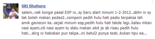 "salam..nak kongsi pasal ESP ni..sy baru start minum 1-2-2012..sblm ni sy tak boleh makan pedas2..compom pedih hulu hati pastu terpaksa lah amik gaviscon ke..sejak minum esp,pedih hulu hati takde lagi..kalau mkan nasi ayam,cili nasi ayam tu slalu makan sikit je sb risau pedih hulu hati...skrg ni habiskan pun takpe..ini betul2 punya testi..bukan tipu ea..."